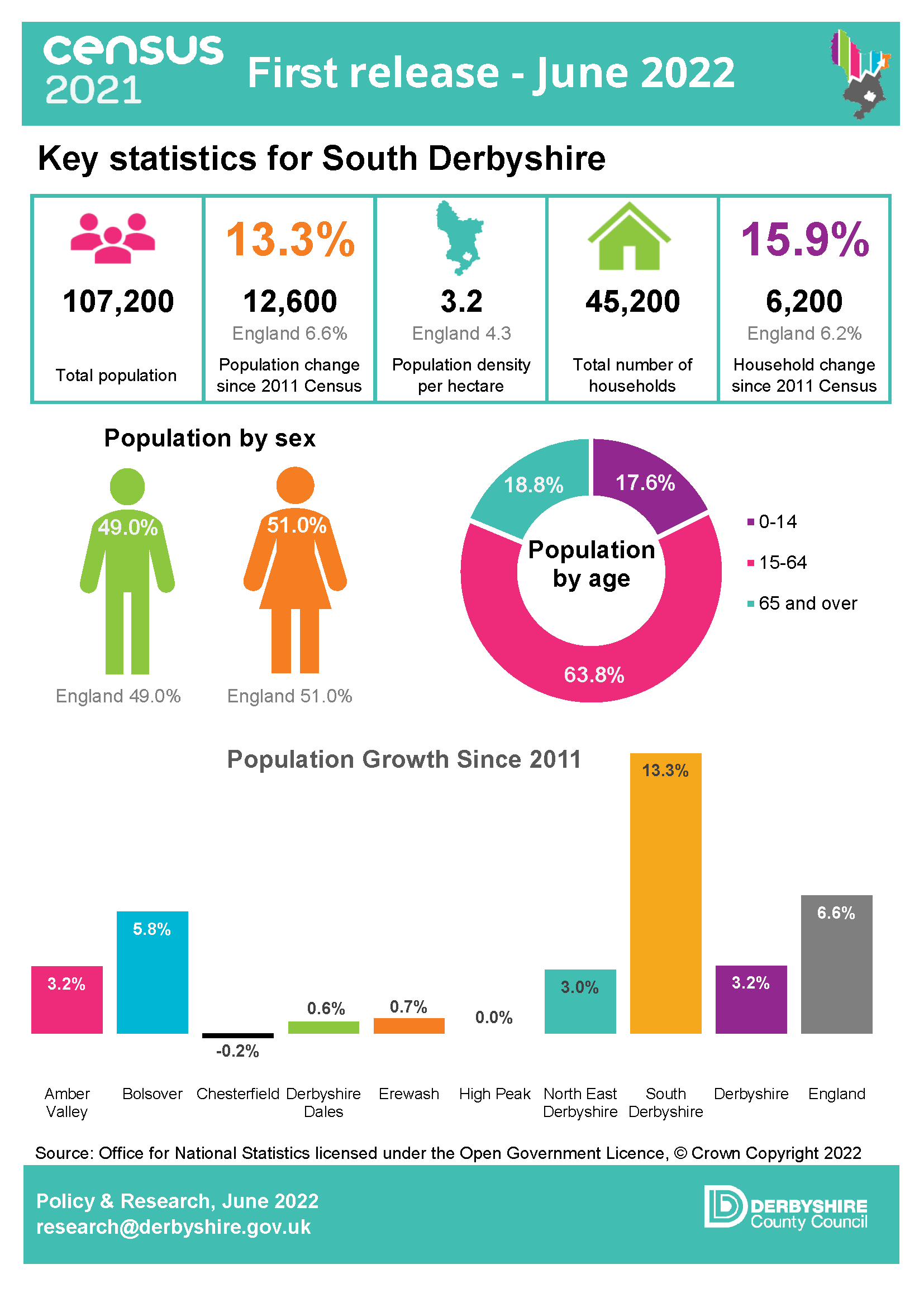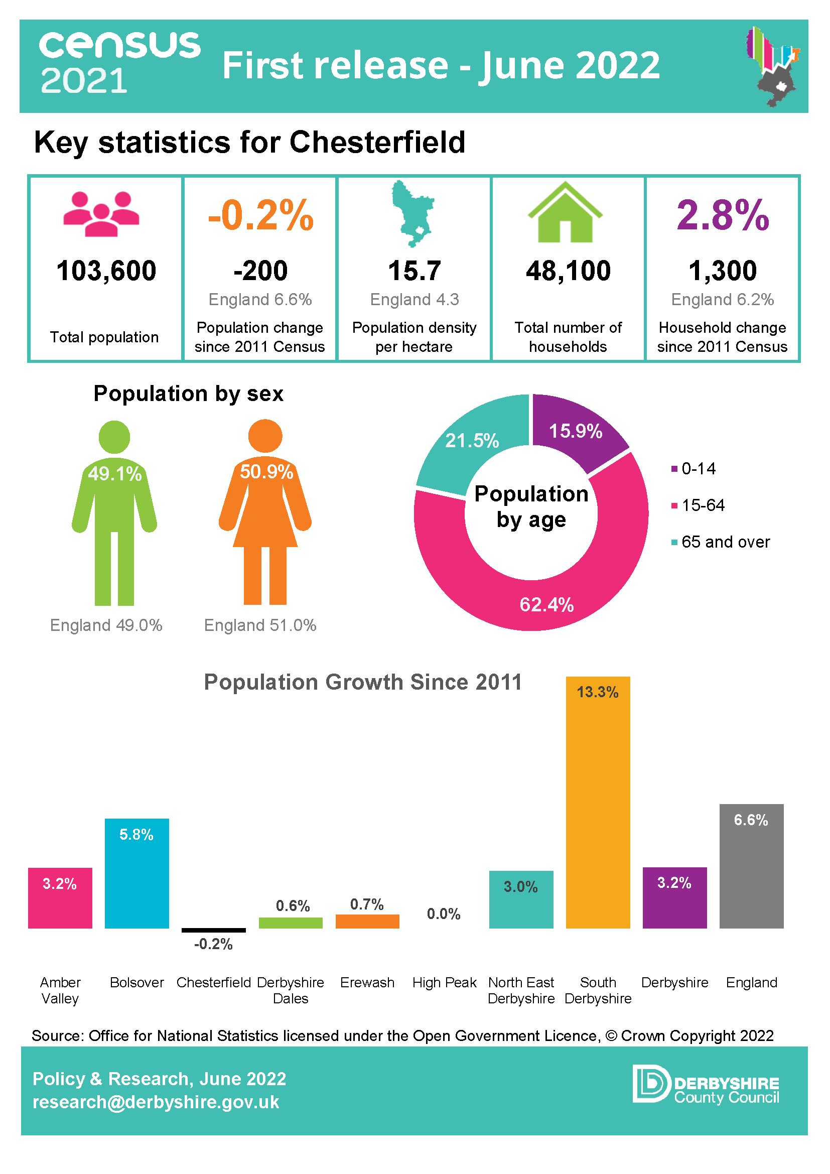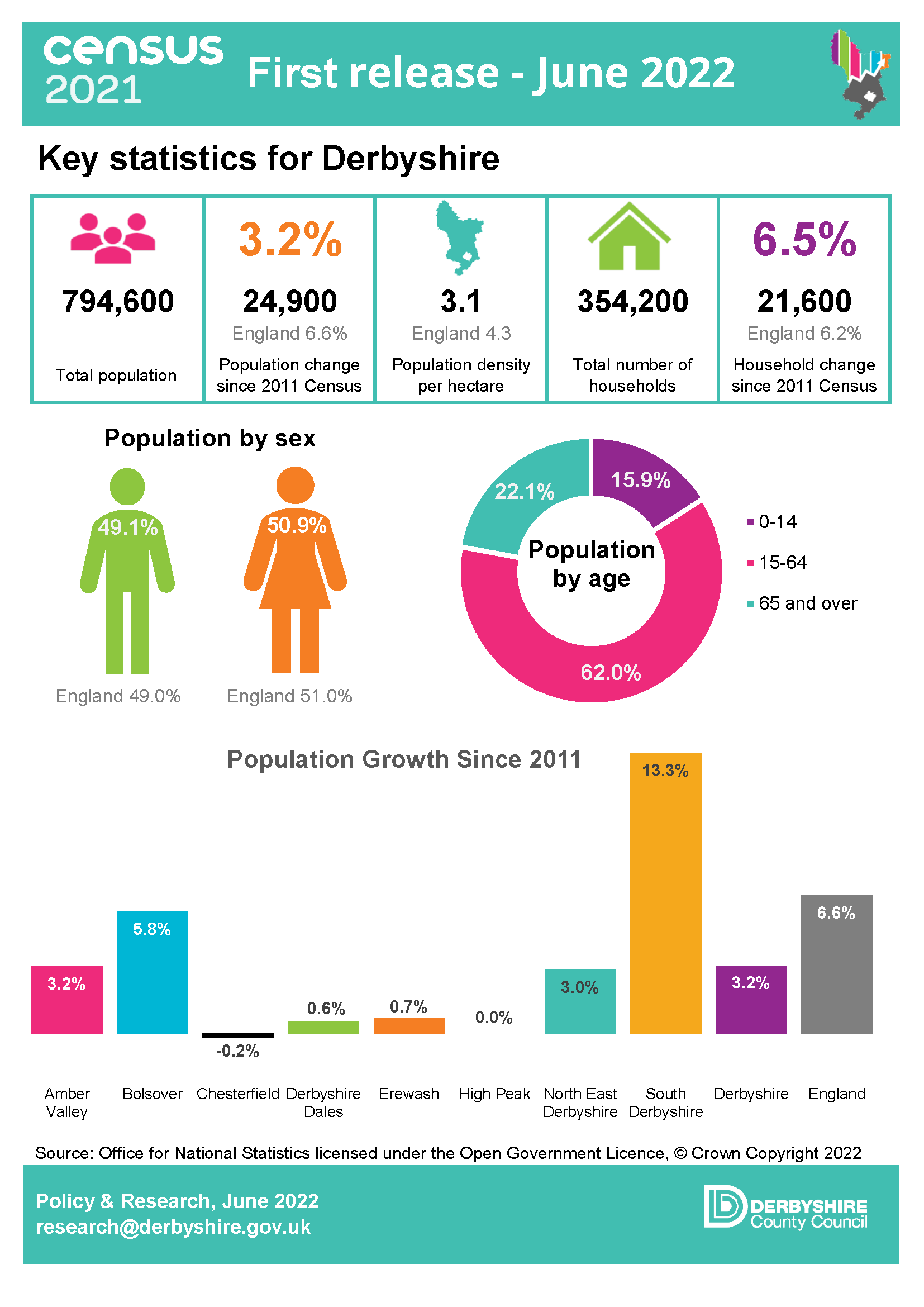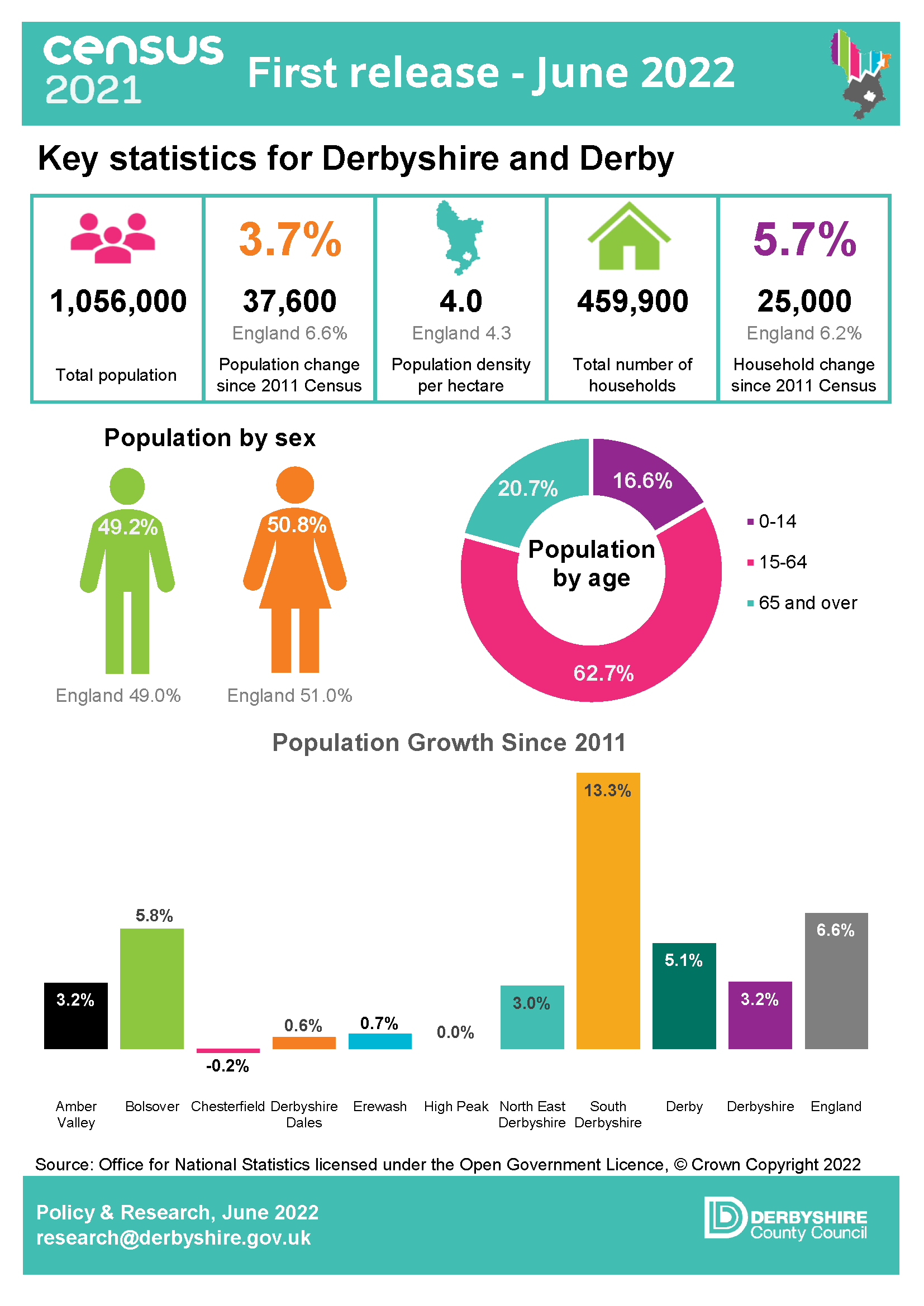 The first set of 2021 Census data was released on 28 June 2022. This included population data by gender, five-year age band and household estimates at local authority level and above. The key findings for Derbyshire can be found in the infographics and links below